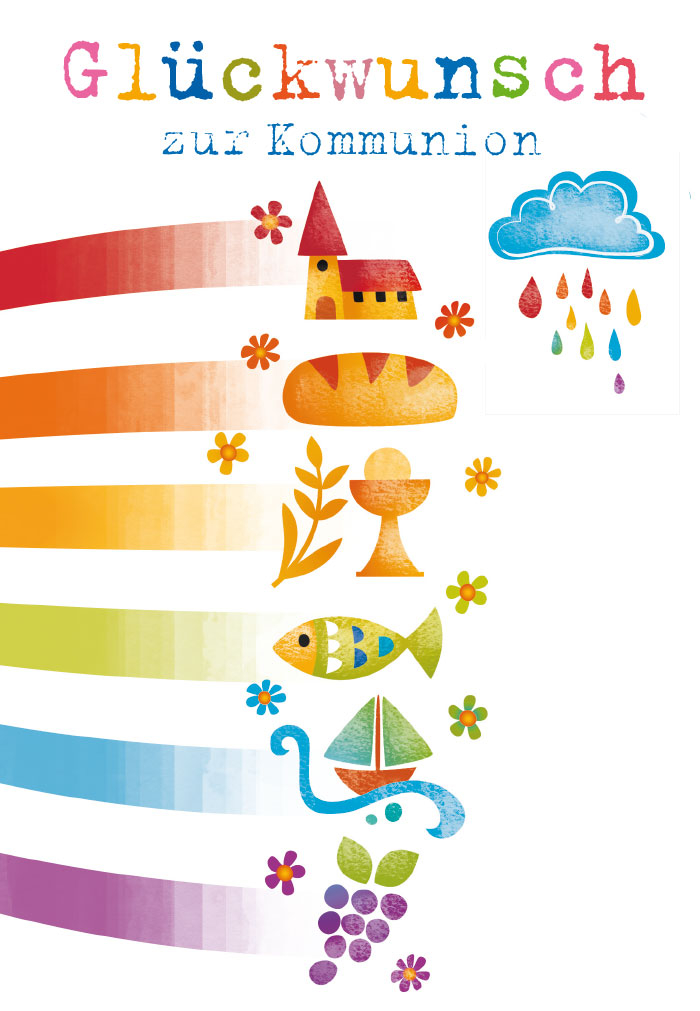 Kommunion - Regenbogen, Kirche, Brot, Kelch mit Hostie, Fisch, Schiff, Trauben