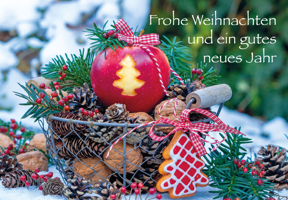 Weihnachten - Apfel mit Weihnachtsbaum, Tannenzapfen, Nüsse