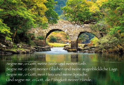 Segne mir, o Gott, meine Seele und meinen Leib. Segne mir, o Gott, meinen Glauben und meine augenblickliche Lage. Segne mir, o Gott, mein Herz und meine Sprache. Und segne mir, o Gott, die Fähigkeit meiner Hände.